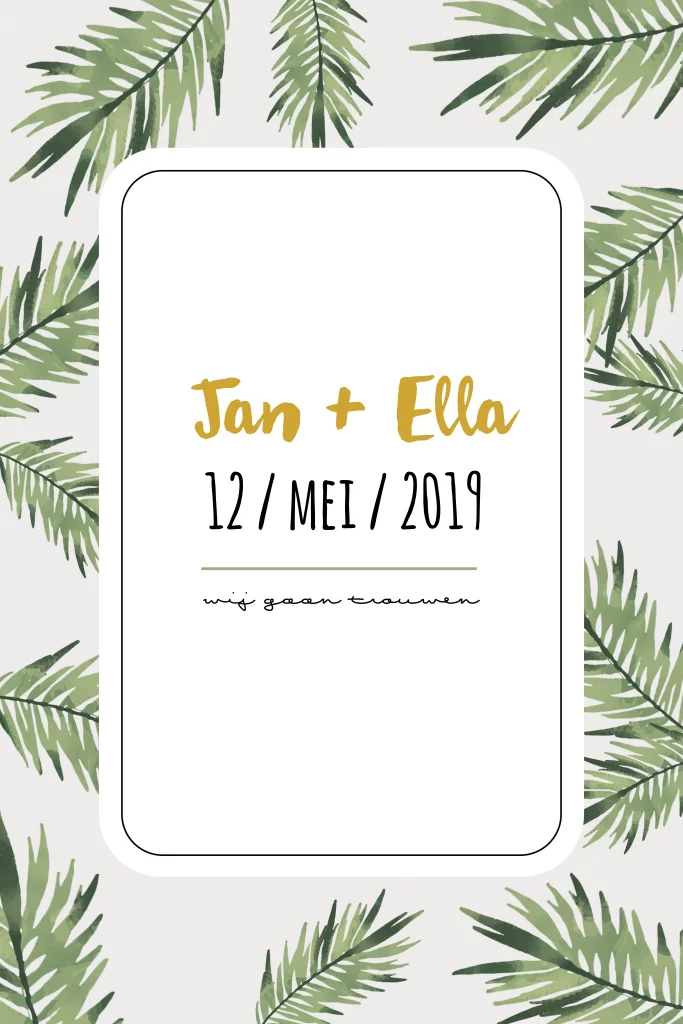 Een mooie trouwhuisstijl, in botanical palm bladeren. Deze trouwhuisstijl kan je gebruiken voor heel je kaarten lijn. Wil je iets anders of zijn er vragen mail ons gerust, dan helpen wij je graag!