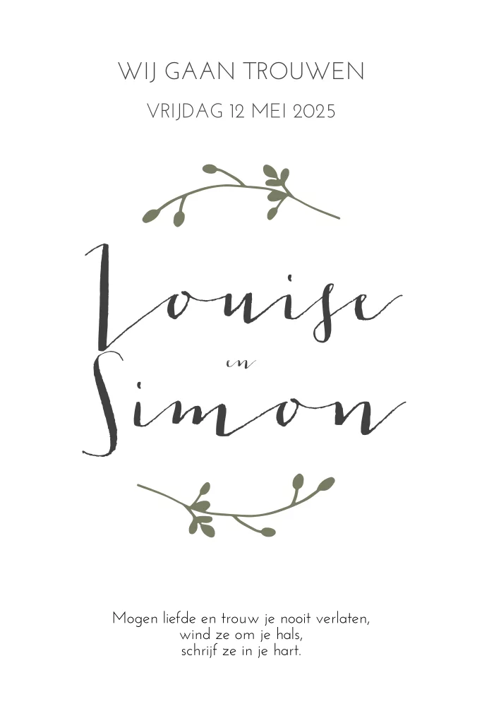 Een mooie trouwhuisstijl, strak en eenvoudig. Deze trouwhuisstijl kan je gebruiken voor heel je kaarten lijn. Wil je iets anders of zijn er vragen mail ons gerust, dan helpen wij je graag!