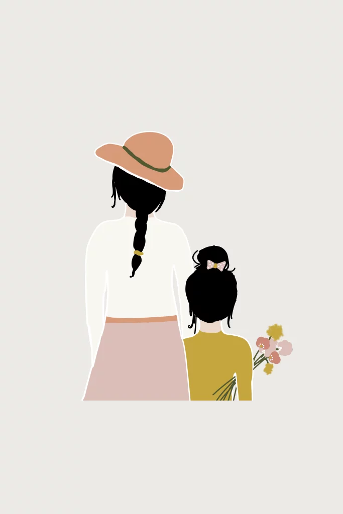 Een leuke wenskaart met een getekende afbeelding van een moeder en dochter. Bestel hem in A5 formaat ( 140 x 210 ) en je hebt een leuke kleine poster.