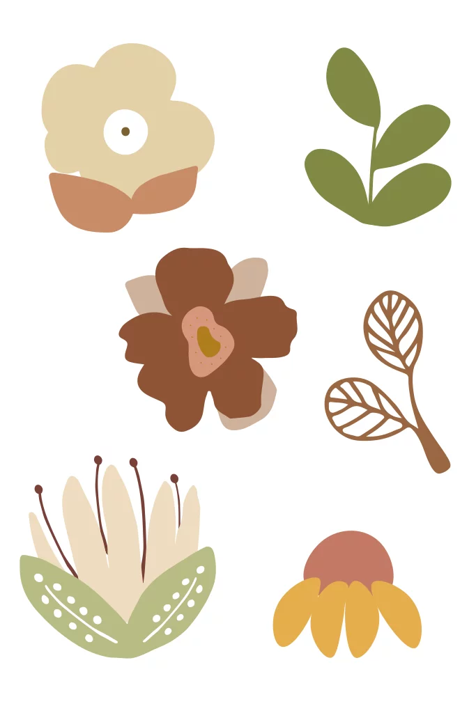 Leuke en vrolijke illustraties van bloemen en takjes.